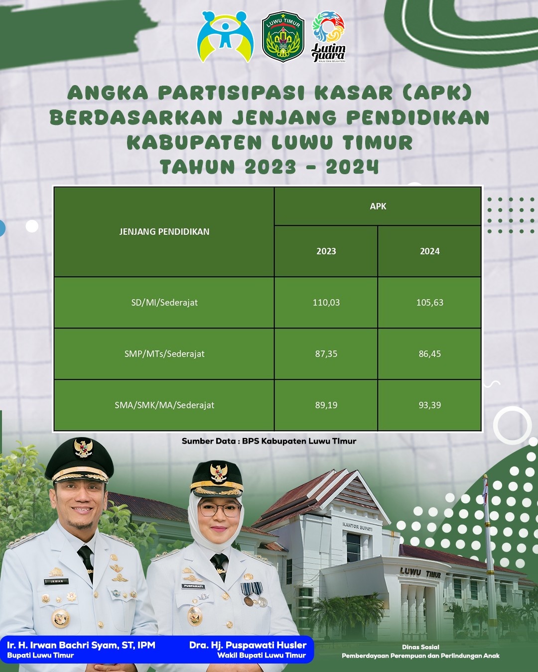 ANGKA PARTISIPASI KASAR (APK) BERDASARKAN JENJANG PENDIDIKAN KABUPATEN LUWU TIMUR TAHUN 2023-2024